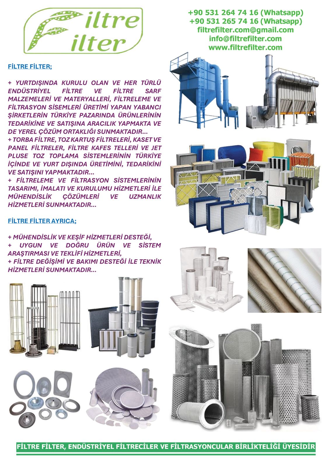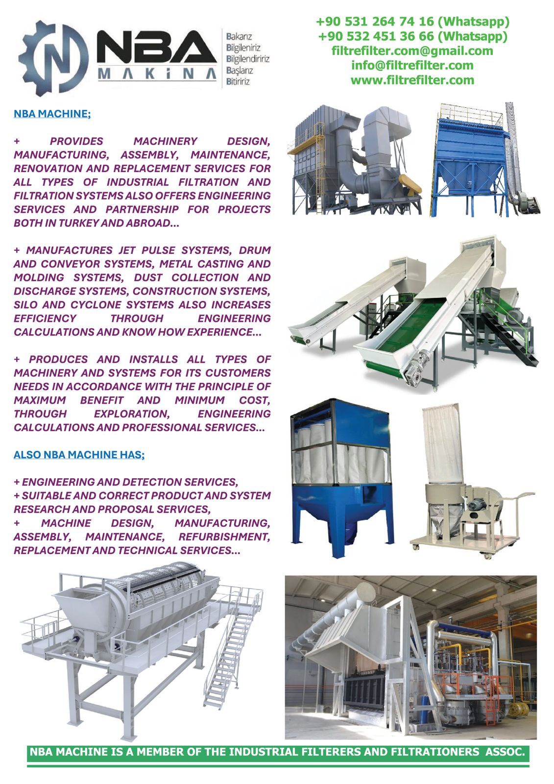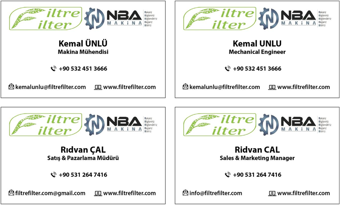 NBA Makina’nın 2010 yılından beri devam uzun yıllara dayalı endüstriyel filtreleme ve filtrasyon sistemleri ve makinaları kurulumu ve bakımı ile mühendislik hizmetleri konusundaki sektörel tecrübesi ve Filtre Filter’in endüstriyel filtre ve filtrasyon sarf malzemeleri (toz torbası, filtre bezi/kumaşı/tekstili, hava ve sıvı filtresi, kartuş/panel/kaset filtre, filtre kafesi/teli) konusundaki sektörel tecrübesi kapsamında müşterilerine yurt içinde ve yurtdışında güvenilir ve sürdürülebilir hizmetler sunan grup şirketleriz…